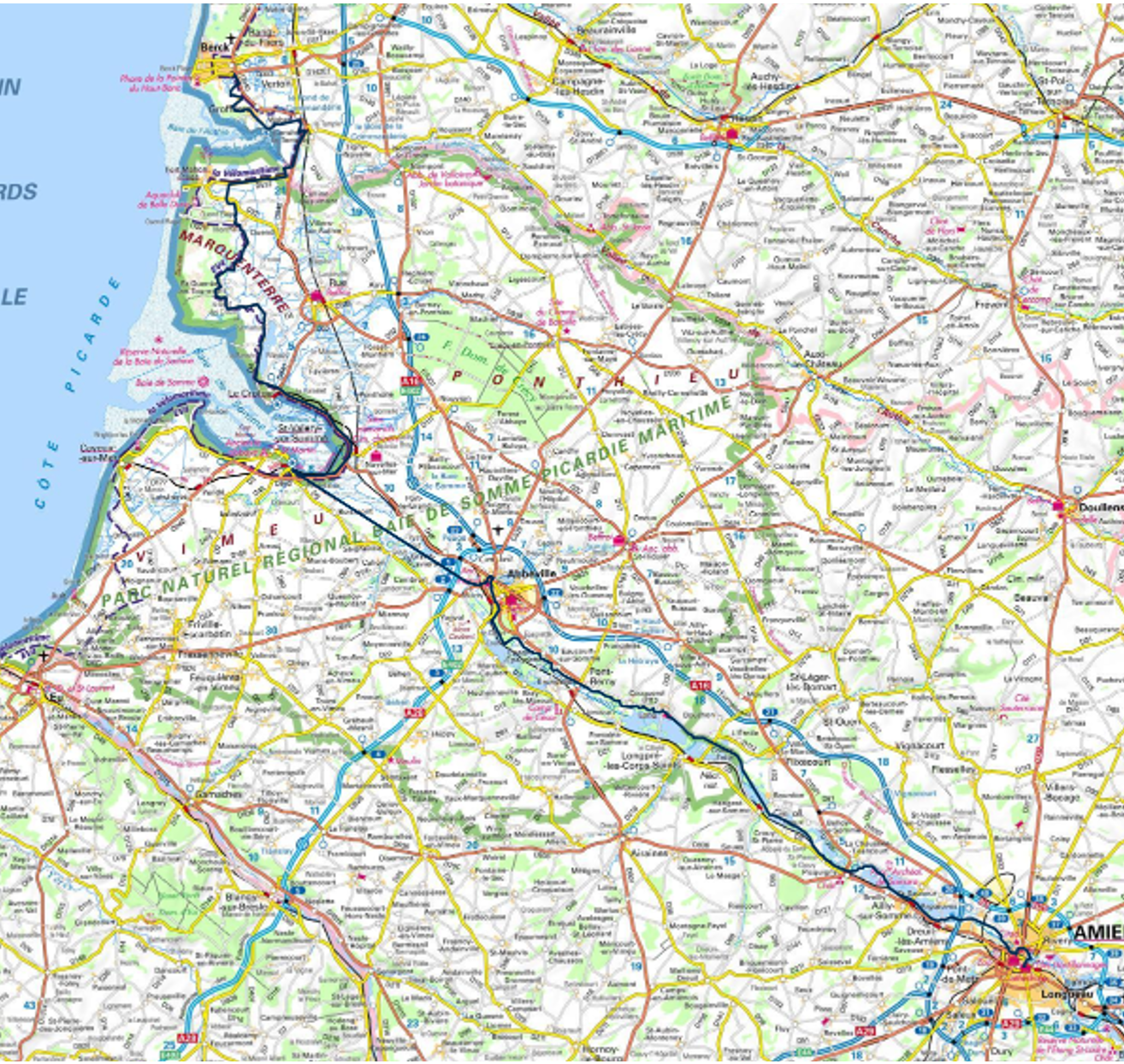 Le départ s’effectue à Amiens, dominée par la majestueuse Cathédrale Notre-Dame, l’une des plus grandes cathédrales gothiques d’Europe. Très vite, l’itinéraire rejoint les berges paisibles de la Somme et longe les célèbres Hortillonnages : un étonnant labyrinthe de jardins flottants et de canaux.