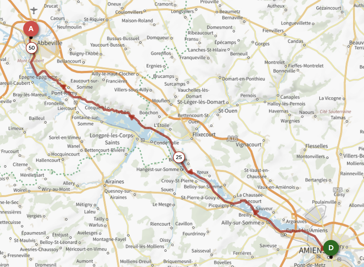 À noter : sur la portion entre Amiens et Abbeville, un vélo de type gravel est fortement recommandé, en raison de certains chemins plus irréguliers et non goudronnés.